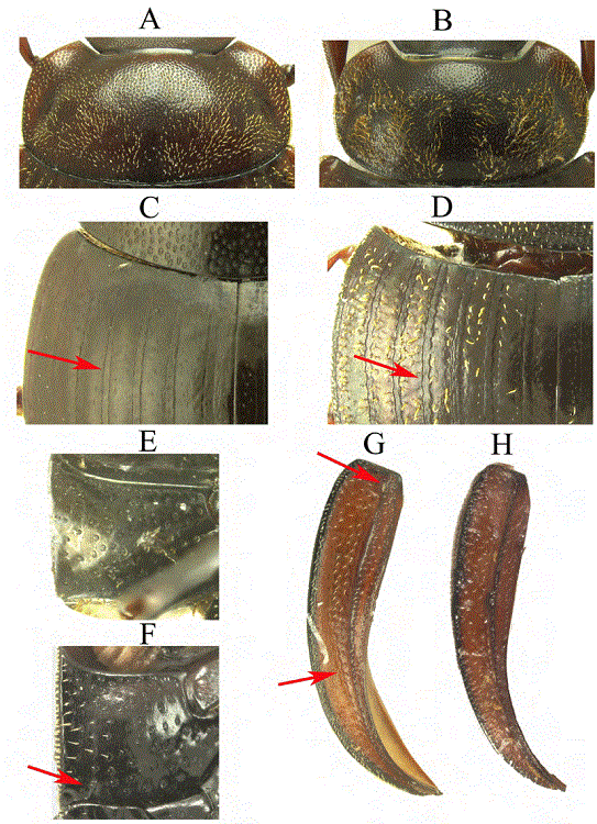 Variación. Machos. Longitud total: 2.63 mm-2.79 mm; ancho humeral: 1.67 mm-1.84 mm. Hembra. Longitud total: 2.45 mm-2.79 mm; ancho humeral: 1.62 mm-1.84mm. Características similares al macho, excepto que el margen interno de la metatibia es casi recto, liso y con ápice interno recto. Dientes clipeales y de la protibia más pronunciados. Protibia sin muesca preapical (Fig. 3D).