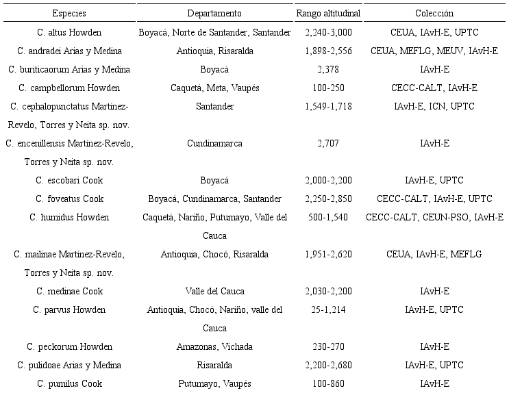 El estudio se realizó con base en especímenes depositados en la Colección Entomológica del Instituto de Investigación de Recursos Biológicos Alexander von Humboldt (IAvH-E). La información adicional sobre la distribución geográfica se obtuvo a partir de la revisión o consulta de registros de las siguientes colecciones (curadores o encargados entre paréntesis):