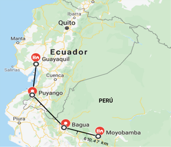 De acuerdo con la información encontrada en los herbarios de la Universidad de Guayaquil en Ecuador; Universidad Nacional Pedro Ruiz Gallo y Universidad Nacional Agraria La Molina (UNALM) en Perú, se ubicaron y monitorearon los sitios de recolecta de la leguminosa endémica C. brachystegia Benth., registrada en sus fichas de identificación. Se recorrieron varios sitios mencionados por las colecciones de los herbarios consultados; sin embargo, solo se logró encontrarla en 5 de 10 localidades de BST reportadas en los herbarios; 3 ubicadas en Ecuador (2 en Guayaquil, provincia del Guayas y 1 en Puyango, provincia de Loja) y 2 en Perú (Moyobamba y Bagua, Departamentos de Lambayeque y Amazonas, respectivamente) (fig. 1). Cabe mencionar que sólo en las localidades de Puyango y Bagua, se encontraron árboles silvestres, en las otras localidades las plantas fueron sembradas varios años atrás. Se recolectaron muestras vegetales (flores y vainas) que fueron identificadas en el Herbario de la Universidad de Guayaquil (Ecuador). Así como también muestras de suelo que fueron analizadas en el Laboratorio del Departamento de Recursos Hídricos de la UNALM.