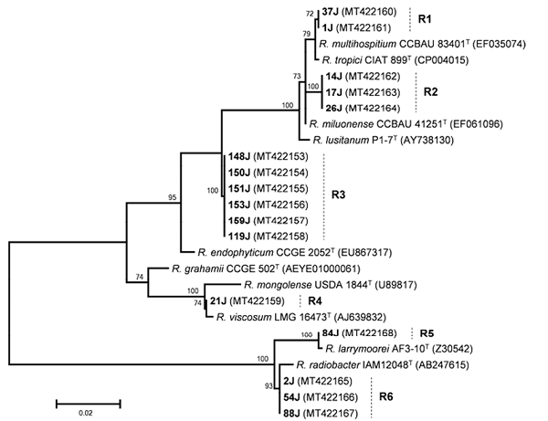 Se evaluaron las relaciones filogenéticas de las cepas secuenciadas construyendo filogramas en base a las secuencias del gen ribosomal 16S. Las cepas de Rhizobium se distribuyeron en 6 grupos marcados como R1 a R6 en la figura 2. Los 2 primeros estuvieron relacionados con especies del grupo tropici (Ribeiro et al., 2012). El grupo 1 con Rhizobium multihospitium y Rhizobium tropici pero presentó la mayor identidad a nivel de secuencia con la primera especie (99.52%), mientras que el grupo 2 se posicionó en forma independiente siendo Rhizobium miluonense la especie con la que mostró la mayor identidad (99.24%). El tercer grupo estuvo formado por 5 cepas, se ubicó en forma independiente en la filogenia y mostró la mayor identidad con Rhizobium endophyticum (98.44%). La cepas 21J y 84J se agruparon con Rhizobium viscosum y Rhizobium larrymoorei compartiendo identidades de 99.81% y 99.9%, respectivamente, con dichas especies.