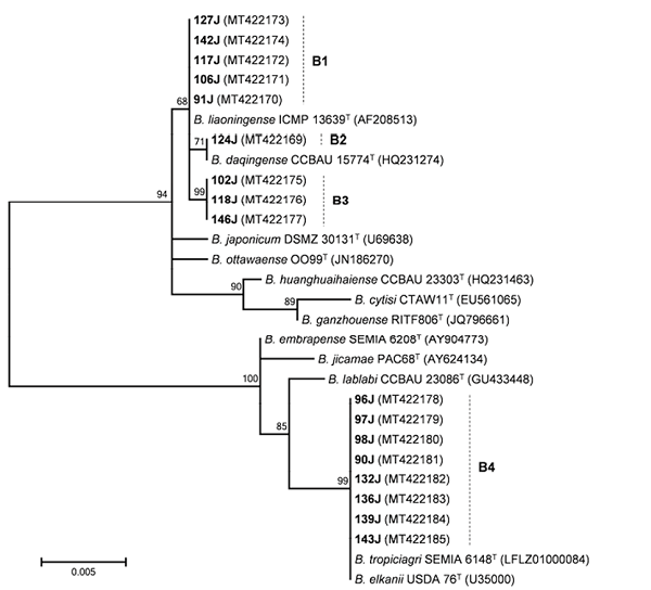 Las cepas de Bradyrhizobium se distribuyeron en 4 grupos señalados como B1 a B4 en la figura. 3. Las cepas de los 3 primeros grupos se ubicaron dentro del supergrupo japonicum que incluye a Bradyrhizobium japonicum (Beukes et al., 2016) mientras que las del cuarto grupo se aliaron con el supergrupo elkanii que contiene a las relacionadas con Bradyrhizobium elkanii (Beukes et al., 2016). Los grupos B1, B2 y B3 se ubicaron en un clado medianamente soportado y poco resuelto donde las secuencias del grupo B1 fueron idénticas a las de Bradyrhizobium liaoningense, la del grupo B2 idéntica a la de Bradyrhizobium daqingense y las del grupo B3 compartieron una identidad de 99.8% con B. japonicum. Las cepas del grupo B4 estuvieron igual de relacionadas a varias especies incluyendo B. tropiciagri (fig. 3). Este último grupo contribuyó con 10 de las 22 cepas de bradyrizobios (45.5%), y todas fueron encontradas en Moyobamba (Perú).