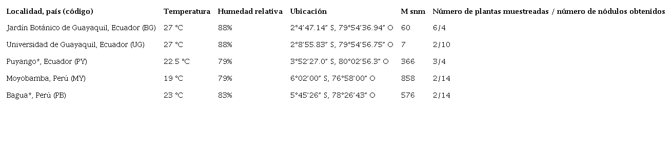 Los aislamientos, pruebas de identificación y tipificación molecular, nodulación y fijación de nitrógeno de las bacterias se realizaron en el Laboratorio de Ecología Microbiana y Biotecnología (LEMyB) del Departamento de Biología de la UNALM. La tabla 1 muestra las localidades de muestreo, promedios de temperatura y humedad relativa anuales, la ubicación geográfica, altitud, el número de plantas y el número de nódulos efectivos que originaron los aislados de rizobios para este estudio. Los resultados del análisis de suelo se presentan en la tabla 2.
