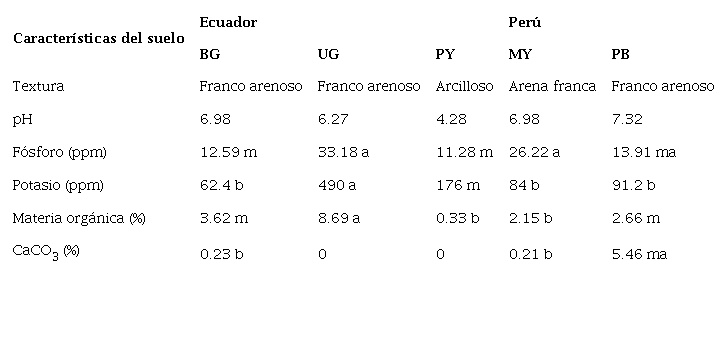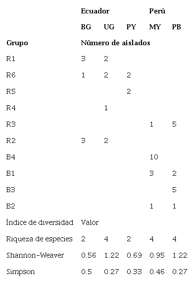 Las localidades que presentaron los mayores valores de diversidad según el índice de Shannon-Weaver y de menor dominancia según el índice de Simpson fueron Universidad de Guayaquil (UG, en Ecuador) y Bagua (PB, en Perú) (tabla 4). En ambas localidades se encontraron rizobios relacionados a 4 grupos diferentes. La localidad UG presentó textura del suelo franco arenosa, pH ligeramente ácido, valores considerados altos de fósforo (P), potasio (K) y materia orgánica (MO) y ausencia de carbonato (CaCO3) (tabla 2). Para el suelo franco arenoso de la localidad PB se registraron valor neutro en pH, alto a mediano en P, y bajos a medianos en K, MO y CaCO3 (tabla 2).