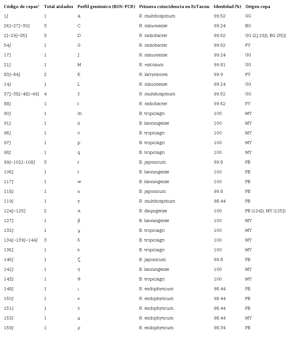 Los perfiles genéticos BOX-PCR se agruparon de acuerdo a su similitud, escogiendo una cepa representante por cada distribución de bandas a las cuales se les secuenció el gen ribosomal 16S. Las secuencias editadas, se analizaron en la base de datos EzTaxon para determinar las cepas tipo más relacionadas (Kim et al., 2012). Se encontraron 24 cepas de Rhizobium, género que se recuperó en las 5 localidades muestreadas (tablas 3, 4). Mientras que el género Bradyrhizobium aportó 22 cepas, encontradas solamente en las localidades de Perú.
