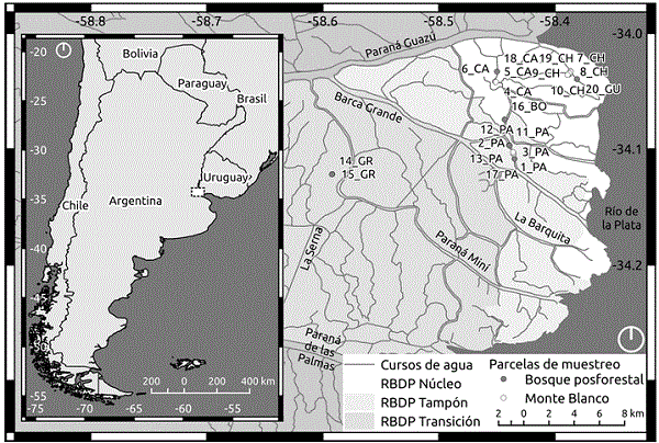 Mediante la observación de imágenes satelitales, relevamientos previos (Kalesnik et al., 2008) y los datos proporcionados por pobladores locales, se seleccionaron sitios de muestreo clasificados a priori como monte Blanco y bosque secundario postabandono forestal (bosque posforestal). Para el caso del bosque posforestal, se utilizó como criterio de selección el conservar aún los individuos de especies forestales, pero con múltiples ramificaciones a baja altura como consecuencia de haber sido cortados. En el caso del monte Blanco, el criterio fue detectar a priori un predominio de especies arbóreas nativas y una ausencia de especies forestales. Las características de los bosques seleccionados fueron corroboradas en campo durante los muestreos, realizados entre los años 2011 y 2014. Las parcelas se ubicaron sobre los arroyos Chivico, Camacho y Guazucito en el área núcleo de la RBDP; sobre los arroyos Pantanoso y Borches en el área tampón; y sobre el arroyo Grande en el área de transición (fig. 1). En cada arroyo, por cada tipo de bosque, se dispusieron de una a cuatro parcelas de muestreo separadas entre sí por 20 m. Se realizaron en total 20 parcelas: 10 clasificadas a priori como monte Blanco y 10 como bosque posforestal.