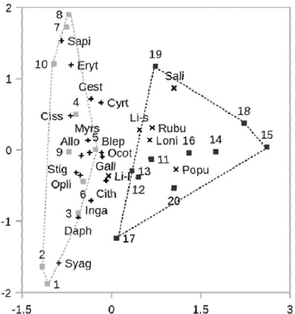 Se realizó un análisis multivariado de la cobertura de las especies registradas mediante un análisis de correspondencia sin tendencia (DCA) utilizando el programa “Canoco for Windows” versión 4.02 (Lepš y Šmilauer, 2003; ter Braak y Šmilauer, 1998). Este análisis se eligió en función de que, según dichos autores, resuelve el problema del efecto arco del análisis de correspondencia (CA) y es más adecuado, en comparación con otros como PCA y NMDS, cuando se desean detectar composiciones transicionales y se trabaja con porcentajes y con una heterogeneidad de datos como los del presente trabajo. Los datos categóricos de la escala Braun Blanquet fueron reemplazados por el valor medio del rango de porcentaje correspondiente, el método para quitar la tendencia fue el de polinomio de segundo orden, se disminuyó el peso a las especies raras mediante la opción provista por el programa, que afecta a aquellas con una frecuencia menor a 20% de la especie de mayor frecuencia, se hizo foco en la distancia entre especies y el tipo de escalamiento fue el de “biplot scaling”. Para los cálculos de cobertura se utilizó el valor central de cada rango de porcentajes. Todas las comparaciones se realizaron mediante la prueba no paramétrica U de Mann-Whitney (Sheskin, 2003) debido a que el tamaño muestral pequeño (N = 10 para cada tipo de bosque) inherente de trabajar con remanentes escasos de bosque nativo, imposibilitaba la utilización de pruebas paramétricas. Todos los cálculos se realizaron mediante el programa XLSTAT versión 7.5.2.