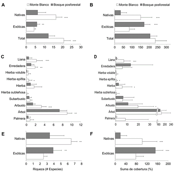 En cuanto a la fisonomía, el monte Blanco tuvo en promedio un mayor número de formas de crecimiento que el bosque posforestal (7.2 ± 1.6 vs. 4.8 ± 1.6; p < 0.01). No se registraron hierbas epífitas ni subleñosas en los censos de bosque posforestal (tabla 1). En términos generales, cada forma de crecimiento tuvo más especies en el monte Blanco y se encontraron diferencias significativas para árboles, arbustos, hierbas epífitas, enredaderas y lianas (fig. 3C). La cobertura de las distintas formas de crecimiento fue en su mayoría similar en ambos tipos de bosque registrándose una superioridad en los censos de monte Blanco para arbustos, hierbas, hierbas epífitas y lianas (fig. 3D).