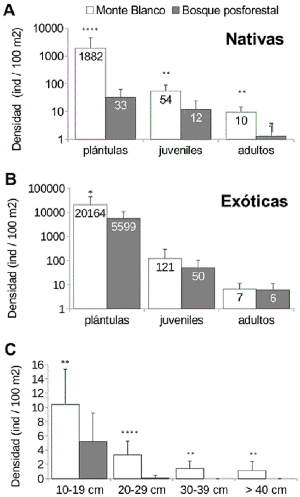 Se contaron 270 árboles adultos, 483 juveniles y 1,286 plántulas en las 20 parcelas de bosques de albardón. Se verificó mayor número y cobertura de especies nativas en el monte Blanco y de exóticas en el bosque posforestal (figs. 3E, F). La densidad de árboles de especies nativas dentro del monte Blanco fue superior a la encontrada en censos de bosque posforestal en las 3 clases de edad: plántulas, juveniles y adultos (fig. 4A). Para el caso de las especies arbóreas exóticas, la densidad dentro del bosque posforestal en comparación con el monte Blanco fue inferior para plántulas y sin diferencias significativas en el caso de juveniles y adultos (fig. 4B). Excluyendo las especies forestales (Populus aff. deltoides y Salix sp.), dentro del bosque posforestal casi todos los árboles adultos correspondieron a individuos de entre 10 y 19 cm de DAP, llegándose a encontrar como DAP máximo un individuo de 20 cm (fig. 4C). Dentro del monte Blanco, la densidad de árboles adultos por censo fue superior a la del bosque posforestal en todas las clases diametrales, llegándose a encontrar ejemplares de hasta 60 cm de DAP.