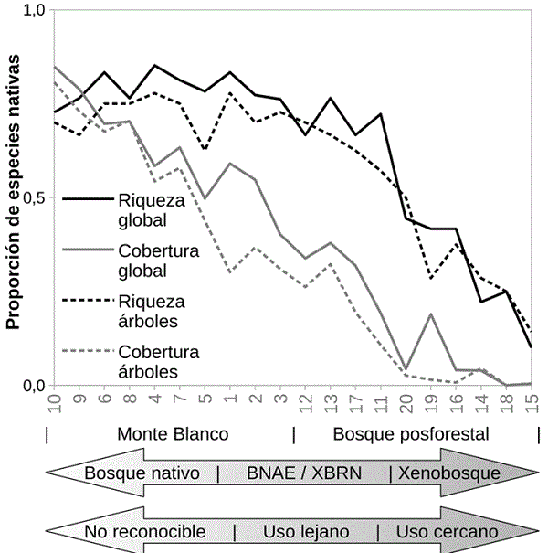 Mediante la investigación pudo verificarse el predominio de autóctonas dentro de los censos clasificados a priori como monte Blanco, corroborándose su tratamiento como bosque nativo. Sin embargo, como ilustra la figura 5, existe un gradiente en la proporción de especies nativas y exóticas para los atributos ecológicos estudiados. En un extremo, los bosques clasificados a priori como monte Blanco de los arroyos Chivico y Camacho cumplen con dicho predominio y pueden ser considerados, sin duda, bosque nativo. En el otro extremo, en las parcelas de bosque posforestal de los arroyos Grande, Borches, Camacho y Guazucito, las especies nativas no alcanzan a superar a las exóticas en ninguno de los atributos y pueden ser considerados en la actualidad bosque exótico, alóctono o xenobosque, sin olvidar que la recuperación natural de especies autóctonas existe, aunque en la actualidad es aún baja. Además de lo discutido en el párrafo anterior, este predominio de exóticas sobre nativas puede explicarse porque el banco de semillas de los bosques secundarios posforestales se encuentra dominado por las mismas especies exóticas que se registraron en pie (Rubus ulmifolius y Ligustrum sinense) y las nativas, a pesar de ser numerosas, son muy poco abundantes (Kalesnik et al., 2013). Por último, en el medio del gradiente los bosques de albardón del arroyo Pantanoso muestran resultados clave en el proceso de recuperación postabandono de especies autóctonas. En todos ellos, el número de especies nativas supera al de las exóticas, sin embargo, este predominio no es alcanzado, en general, para valores de cobertura. Por lo tanto, pueden clasificarse como bosque nativo con abundancia de exóticas, o xenobosque rico en nativas. En el arroyo Pantanoso, las parcelas de bosque clasificado a priori como monte Blanco corresponderían, por la presencia de zanja de sistematización y el relato de pobladores locales, también a bosques secundarios postabandono productivo, pero frutihortícola en vez de forestal. En consecuencia, los resultados son compatibles con un paralelismo en las dinámicas sucesionales de especies exóticas y nativas en la que las primeras dominan los estadios iniciales y se observa un cambio hacia especies más tolerantes a la sombra, pero luego se estabiliza su número y es superado por las nativas (McLane et al., 2012). Sin embargo, la falta de fuentes de propágulos de estas últimas, sumada a la presión de propágulos de la especies introducidas por el humano, pueden dar como resultado estos bosques nativos con abundancia de exóticas (Richardson et al., 2007).