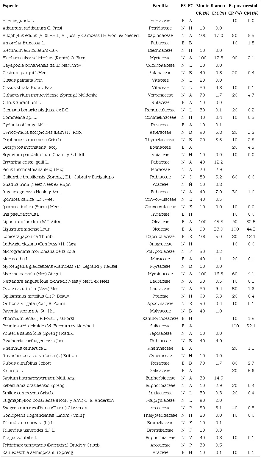 En la tabla 2 se proporcionan atributos poblacionales de las especies de árboles de los bosques en estudio. Al igual que para cobertura, las mayores densidades fueron para Myrsine parvula, Allophylus edulis, Blepharocalyx salicifolius, Ligustrum lucidum y L. sinense. En cambio, a pesar de su considerable cobertura, Erythrina cristagalli, Sapium haematospermum, Populus aff. deltoides y Salix sp. tuvieron bajas densidades. En cuanto a los patrones de estructura poblacional, dentro del monte Blanco predominó el de reproductor frecuente y dentro del bosque posforestal, el de incorporación reciente (tabla 2). En ambos bosques también se registraron patrones nómades, tanto para especies nativas como exóticas.