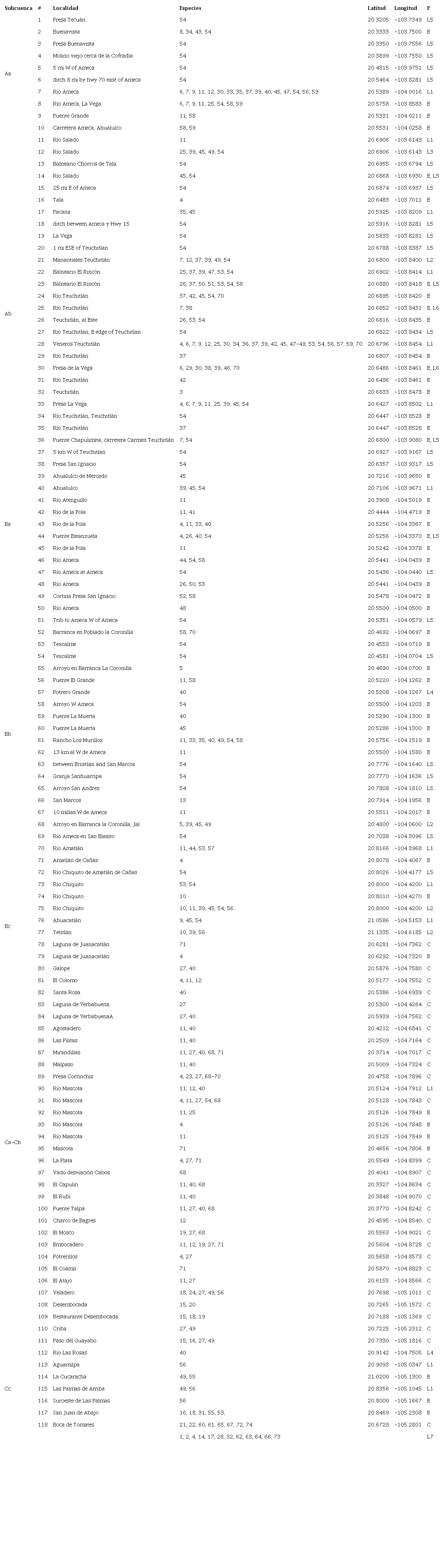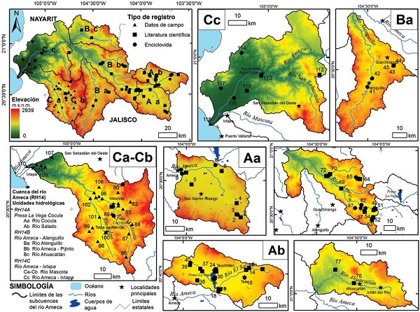 Los datos de campo se obtuvieron mediante muestreos en 26 localidades en ambientes lóticos y 3 de ambientes lénticos de la subcuenca del río Mascota, durante la temporada seca (mayo 2018), ubicadas entre los 0 y 1,954 m snm. La recolecta se realizó siguiendo las recomendaciones de Lyons et al. (1995), Mercado-Silva et al. (2002), Ramírez-Herrejón et al. (2012) y Moncayo-Estrada et al. (2015). Los muestreos fueron diurnos, con una duración de 30 minutos y realizados en todos los hábitats disponibles para los peces. Los organismos se recolectaron mediante electropesca, utilizando el equipo SAMUS 725MP y siguiendo las recomendaciones de voltaje y pulso de Mercado-Silva y Escandón-Sandoval, (2008) y recorriendo una distancia aproximada de 100 m. El muestreo se complementó con atarraya. Las especies se identificaron con las guías especializadas de Miller et al. (2009) y de Warren (2009) y fueron corroboradas por especialistas de la Colección de Peces de la Universidad Michoacana de San Nicolás de Hidalgo (CPUM, Semarnat MICH.PEC-227-07-09). En esta misma colección se depositaron ejemplares de referencia que están en proceso de etiquetado y serán registrados con los números de catálogo: CPUM-14829 al 14834. Este muestreo se complementó con análisis de las capturas de pescadores ribereños en la desembocadura del río Ameca durante febrero de 2018. La identificación de especies se realizó con apoyo de los trabajos de Allen y Robertson (1994), Fischer et al. (1995) y Castro-Aguirre et al. (1999). De este grupo, solo se incluyeron las especies presentes en el medio acuático continental clasificadas como eurihalinas, vicarias y estuarinas de acuerdo con los criterios de Castro-Aguirre et al. (1999) y Espinosa-Pérez et al. (2002).