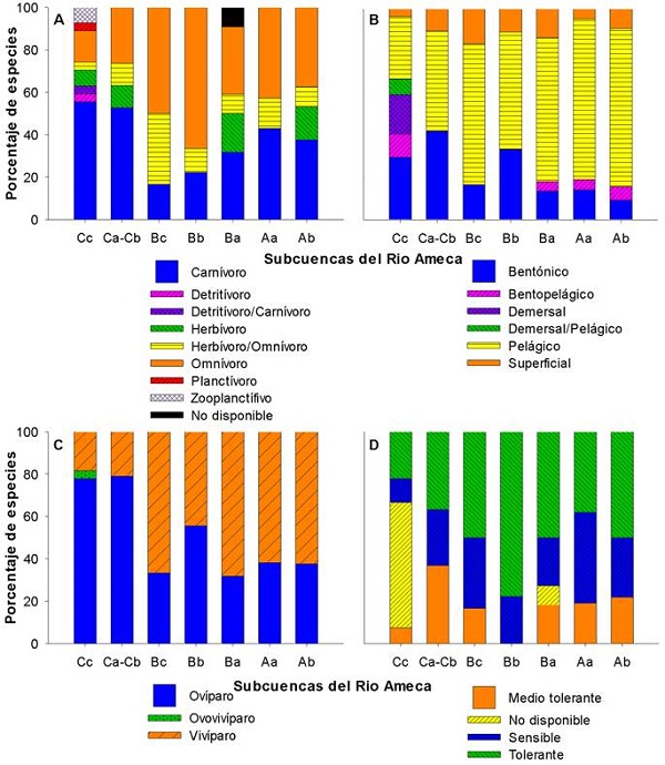 El ensamblaje de peces del río Ameca presenta distintas características ecológicas, por ejemplo, se muestra que el tipo de alimentación de las especies varía en las distintas subcuencas. Particularmente en las partes bajas (Cc y Ca-Cb), las especies tienen tipos de alimentación variados, pero la mayoría son carnívoras. En las partes medias (Bc, Bb, Ba) y altas (Aa y Ab), se registran especies principalmente omnívoras y carnívoras, seguidas de especies herbívoras/omnívoras y herbívoras (fig. 3A). Respecto a la posición de los peces en la columna de agua, se observa que son especies principalmente pelágicas, bentónicas y superficiales. Solo en la parte baja de la cuenca (Cc y Ca-Cb) se presenta poca representatividad de especies pelágicas y se registran especies dermesales (fig. 3B). Referente al tipo de reproducción de los peces, en las subcuencas de las partes bajas (Cc y Ca-Cb) existe un alto predominio de las especies ovíparas, seguidas de vivíparas, y se registran además especies ovovivíparas. Por el contrario, en las partes medias (Bc, Bb y Ba) y altas (Aa y Ab), se presentan proporciones similares de especies vivíparas y ovíparas (fig. 3C). Con relación a la tolerancia de las especies a la degradación ambiental, se registra que en todas las subcuencas existe una gran proporción de especies tolerantes, seguidas de especies sensibles y medio tolerantes (fig. 3D). Cabe destacar que para la subcuenca Cc, se desconoce el nivel de tolerancia de la mayor parte de las especies. La mayoría de los peces registraron 1 o más tipos de aprovechamiento (39 spp, 53%), principalmente con fines comerciales (31), de pesca deportiva (3) y acuícolas (6), este último realizado únicamente con especies introducidas. Seis especies de atractivo visual como Ameca splendens y pecílidos translocados, como Xiphophorus hellerii, son utilizadas para el acuarismo, mientras que los 3 centrárquidos introducidos del género Lepomis son destinados como peces forrajeros para pesca deportiva, principalmente de la lobina (Micropterus salmoides) (tabla 1).