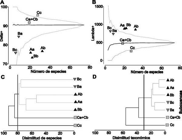 El arreglo taxonómico de la composición de peces entre las subcuencas del río Ameca no presentó grupos de subcuencas estadísticamente significativos (p > 0.05, SIMPROF). Así mismo, se mostró que las subcuencas de la parte alta y media (Ab, Aa, Bb, Bc y Ba) presentan una baja disimilitud taxonómica siendo de 19%. Por su parte, las subcuencas de las partes bajas Ca-Cb y Cc sí mostraron un arreglo taxonómico diferenciado (p < 0.05, SIMPROF), con un porcentaje de disimilitud taxonómica de 37% y 56%, respectivamente (fig. 4D).