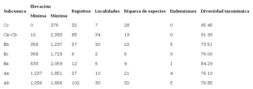 La riqueza de especies de esta región ha sido bien documentada para la parte alta, donde se han reportado cerca de 20 especies (5 endémicas) (Miller et al., 2009; Pedraza-Marrón, 2011). Sin embargo, los trabajos que consideran la totalidad de la cuenca son escasos y no han estudiado suficientemente la parte baja y la desembocadura. Entre ellos se encuentran los de López-López y Paulo-Maya (2001), Guzmán y Lyons (2003) y Pedraza-Marrón (2011), quienes reportan una riqueza de 26, 50 y 29 especies respectivamente (especies nativas e introducidas). Esta disparidad en la riqueza reportada y la insuficiencia de estudios en las partes bajas de la cuenca demanda la actualización del listado taxonómico regional espacialmente explícito que permita, en conjunto con evaluaciones de la diversidad, la identificación de áreas de importancia para la conservación de este grupo.