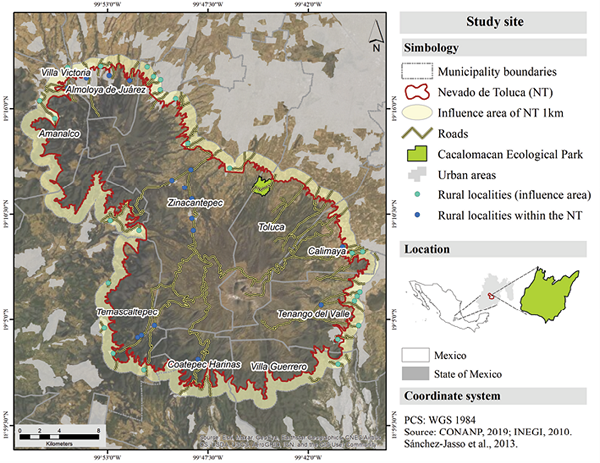 The Nevado de Toluca, like other PA in Mexico, encompasses many communities within its 53,589 hectares (Héritier & Leberton, 2017), including 10 municipalities, 16 rural communities and more than 5,000 inhabitants (INEGI, 2010). Together with a surrounding 1 km influence area, results in 41 communities interconnected by roads (DOF, 2016b; INEGI, 2011; Fig. 1).
