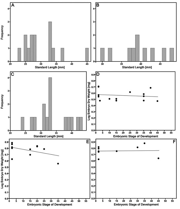 Embryo dry weight either remained more or less constant or decreased strongly with developmental stage, which is congruent with a predominantly lecithotrophic provisioning strategy (MI, P. latipunctata, EL = 0.73; MC = 1.01; P. mexicana, EL = 0.90; Fig. 2D-F). This confirmed the pattern we found for embryo lean weight (see above), because based on this, P. latipunctata produced larger neonates than P. mexicana (estimated dry weight at birth, P. latipunctata, EL = 4.00 mg, MC = 5.82 mg; P. mexicana, EL = 3.33 mg). We did not find any evidence for superfetation in P. latipunctata, P. mexicana, and P. formosa, as all developing embryos per female were always of approximately the same developmental stage.