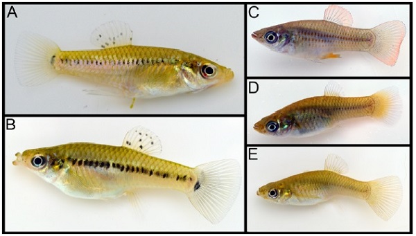 The Tamesí molly, Poecilia latipunctata, is a small livebearing fish of the family Poeciliidae, is critically endangered, and native to headwaters of the Río Tamesí in northeastern Mexico (Contreras-Balderas & AlmadaVillela, 1996; Tobler & Schlupp, 2009). The species has a relatively small range, which makes P. latipunctata especially vulnerable to habitat changes (Miller et al., 2005). The most important threats to the survival of this species stem from invasive species as well as fragmentation and deterioration of suitable habitat as a result of local agricultural practices (Tobler & Schlupp, 2009). Biologically, this species is of special interest for at least 3 reasons. First, despite the fact that it looks like a short-fin molly (Fig. 1A-E), it actually belongs to the long-fin mollies (Ptacek & Breden, 1998; Schartl et al, 1995). Second, it is sympatric with 2 other mollies, the Atlantic molly (Poecilia mexicana) and the Amazon molly (Poecilia formosa), and has been reported to be one of the few natural sperm donors for P. formosa (Niemeitz et al., 2002), an all-female hybrid species that reproduces via gynogenesis (i.e., sperm-dependent parthenogenesis; Schlupp & Riesch, 2011). This role is critical as P. latipunctata is a sperm donor species that was not involved in the hybridization event that led to Amazon mollies, and the mating system in the area of Ciudad Mante is one of very few described to have more than 1 sperm donor species (Joachim & Schlupp, 2012; Schlupp, 2009). Third, it is also invasive in at least 1 habitat outside its natural range. While it seems that an introduction into Florida, USA, has failed (there are no confirmed observations since 1971; Neilson, 2019), it has established a thriving population in La Media Luna, San Luis Potosí, México (Miller et al., 2005; Palacio-Núñez et al., 2015).
