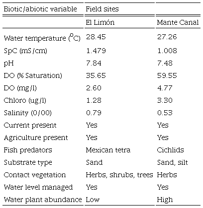 We collected fishes from 2 different localities in northern México, near Ciudad Mante in May 2010, and preserved all specimens in 10% formaldehyde under the guidelines granted in the collection permit from the Mexican government (SEMARNAT=SGPA/DGVS/02221/10). Due to the endangered species status of P. latipunctata we were only able to collect a small number of fishes. Furthermore, P. latipunctata has a small geographic range with low abundance and thus, the number of sites we could use for comparison was limited in our study (García-De León et al., 2018; Tobler & Schlupp, 2009). We therefore focused on 2 sites: one was located in the canalized headwaters of the Río Mante (Mante Canal or MC hereonafter: 22°42’54.79” N, 99°1’18.83” W; Río Guayalejo/Pánuco drainage). This is a wide channel that takes water a short distance from the spring to provide water for agriculture. The second was a small ditch in between sugarcane fields within the same river drainage north of Ciudad Mante called El Limón (EL: 22°48’44.57” N, 99°0’44.55” W; Río Guayalejo/Pánuco drainage). At MC, we collected P. latipunctata and P. mexicana, while at EL, we collected all 3 species: P. latipunctata, P. mexicana, and P. formosa. Using a Hydrolab© Multisonde, we also measured several physicochemical characteristics: water temperature, pH, turbidity, oxygen content, salinity, chlorophyll and specific conductance. Our qualitative measurements included: the presence of a current, agriculture, predators, the type of substrate, contact vegetation, if the water level was managed, and the level of abundance of water plants (Table 1). All preserved specimens were then transferred to the University of Oklahoma in Norman, Oklahoma (USA) for further analyses.