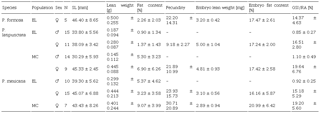 Nonetheless, very little is currently known about the basic biology of P. latipunctata, and how it might interact with syntopic P. formosa and P. mexicana. Here, we therefore report on basic life histories for 2 natural populations of P. latipunctata. Moreover, we compare aspects of male and female life histories of P. latipunctata to those of syntopic P. mexicana and P. formosa. With regards to the latter, we address 2 different questions: 1) What are some of the life-history differences between the 3 species? 2) Are these life-history differences similar or different between the 2 different population?