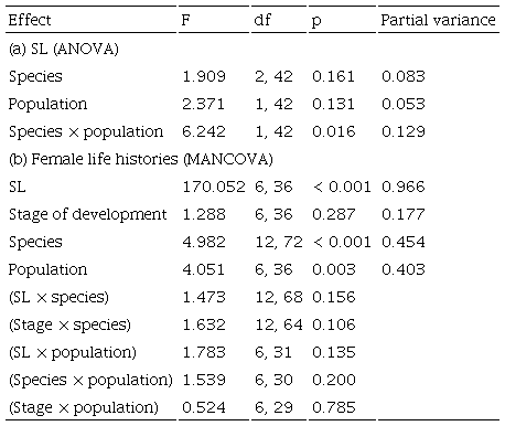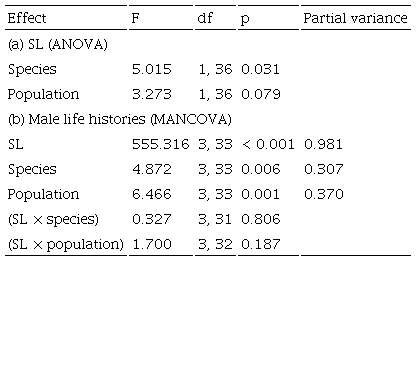 In a second step, we then ran 2 sex-specific multivariate general linear models (MANCOVA) on the remaining life histories. For the male model, we included the traits lean weight, fat content and GSI as dependent variables, species and population were again the factors, and SL now served as a covariate. We further included the interactions between SL and the 2 factors in the initial model but removed any nonsignificant interactions with p > 0.1 from the final model. For the female model, we included the traits lean weight, fat content, fecundity, offspring lean weight, offspring fat content, and RA as dependent variables, species and population were the factors, with SL and offspring stage of development now served as covariates. We further included all possible two-way interactions between the factors and covariates in the initial model, but again removed any nonsignificant interactions (p > 0.1) from the final model.