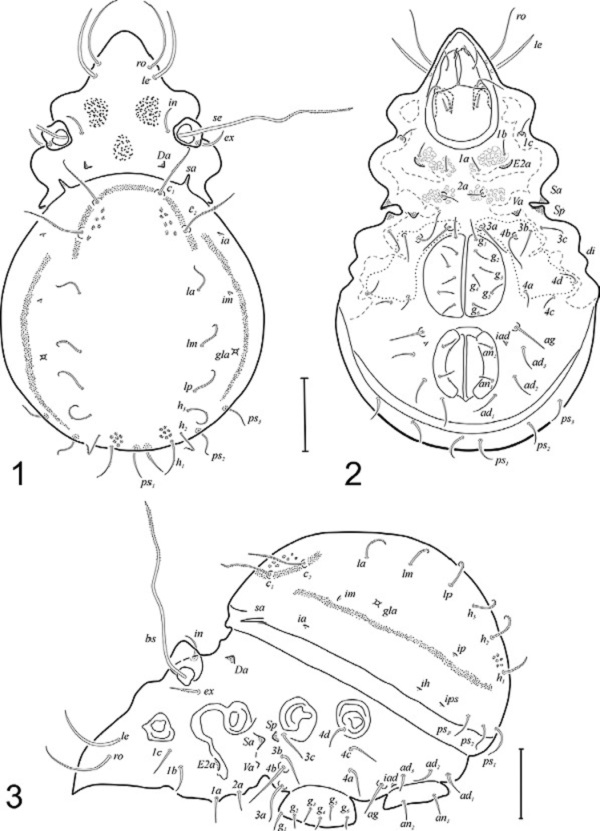 Notogáster (Fig. 1): ovalado, ligeramente más alargado que ancho, sin exuvias ninfales, con una hilera de sigilas que corren lateralmente desde la parte anterior del notogáster hacia la posterior, hasta la inserción de la seda h1; 8 pares de sedas notogastrales dorsales, c1 (75 ) y c2 (65), de mayor longitud y dirigidas anteriormente; curvas en su parte distal, insertadas en alvéolos tuberculados sobre una cresta en forma de herradura en la parte anterior del notogáster ; lateralmente, un par de crestas similares se extienden a lo largo del notogáster; sedas restantes de menor tamaño (30), curvas en su parte distal; todas las sedas notogastrales son lisas en la mitad basal y finamente barbuladas unilateralmente en la mitad distal; 1 par de espinas adnatas dirigidas anteriormente, angostas y alargadas, terminando en punta, de tamaño considerable (41). Entre las sedas c1 y c2, existe a cada lado un cúmulo de entre 6 y 8 sigilas. En la parte posterior del notogáster, entre la inserción de sedas h1, se encuentra otro grupo con el mismo número de sigilas, uno a cada lado. Lateralmente, entre sedas lm y lp, se ubican las aberturas de las glándulas opistosomales; con 6 pares de lirifisuras, propias de la familia (Figs. 1-3).