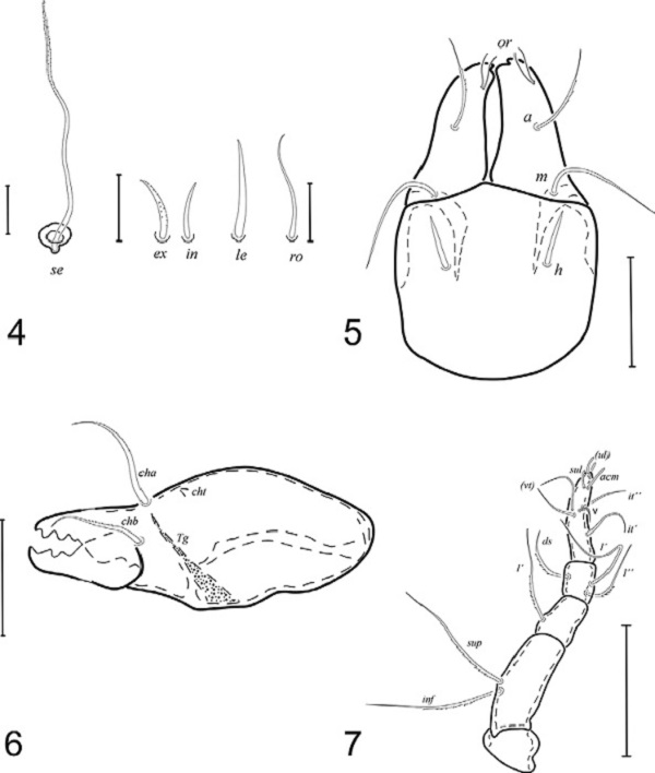 Gnatosoma (Fig. 5): mento subcapitular, ligeramente más ancho que largo; seda m (48) lisa y más larga que seda a (40) y h (28). Seda h gruesa, la más corta del subcapítulo, seda a ligeramente barbulada unilateralmente, en su parte media distal; existe un par de sedas adorales. Quelíceros. Sedas cha (43), chb (38) ligeramente barbuladas unilateralmente, cht (4) es muy corta (Fig. 6); quetotaxia de los pedipalpos , solenidio entre paréntesis: 2-1-3-8(1) (Fig. 7).