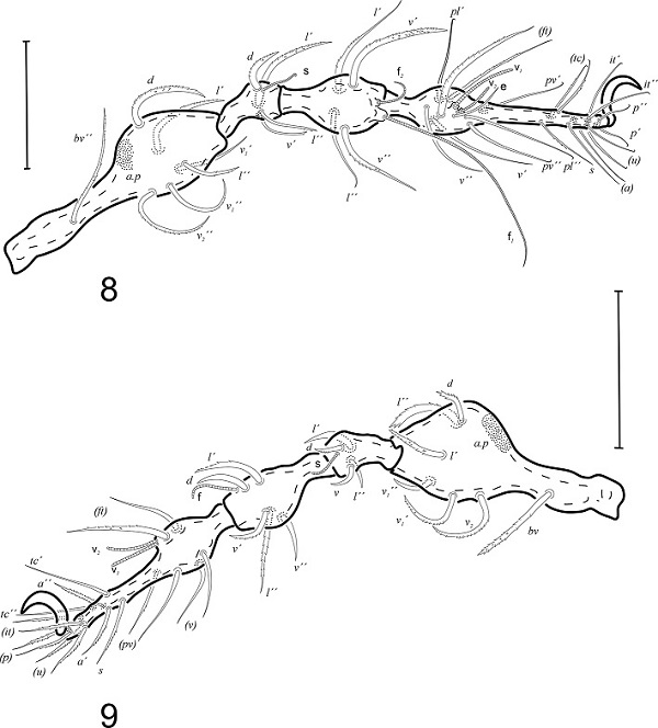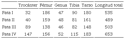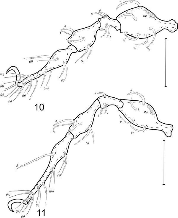 Patas (Figs. 8-11): artejos con una capa gruesa de cerotegumento, sólo la porción distal del tarso se encuentra libre de cerotegumento. Quetotaxia, incluido fámulo, solenidios en paréntesis: pata I, 1-7-4(1)-4(2)-20(2); pata II, 1-7-4(1)-5(1)-17(2); pata III, 2- 5-3(1)-4(1)-17; pata IV, 2-4-3-4(1)-14. Fémures I-IV, con áreas porosas. No se observaron variaciones en la quetotaxia de las patas. Pata IV (653), la de mayor longitud; pata II (489), la menor. Longitud de los artejos de las patas se presentan en la Tabla 1. Forma y distribución de sedas se presentan en las Figuras 8-11(trocánter omitido).