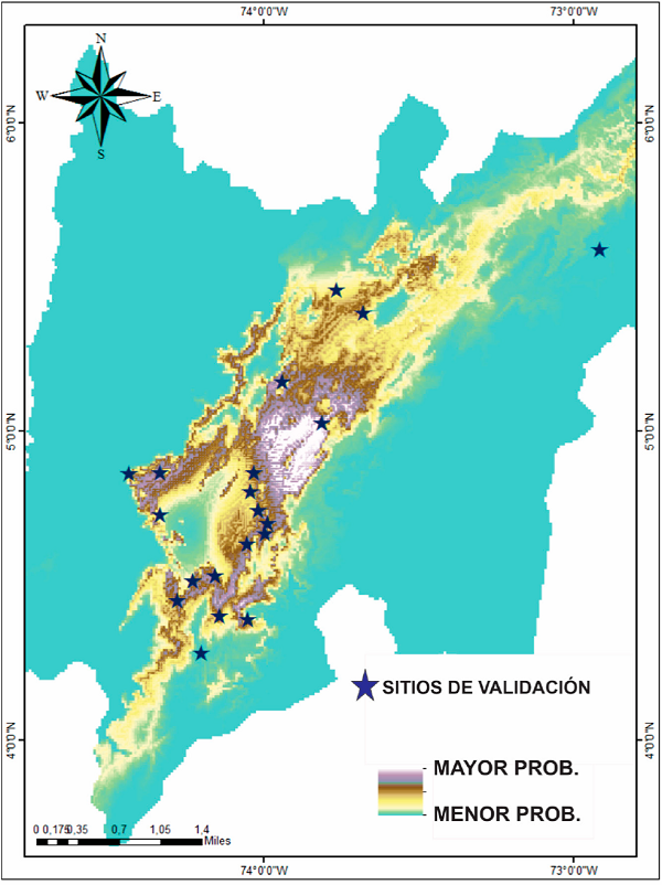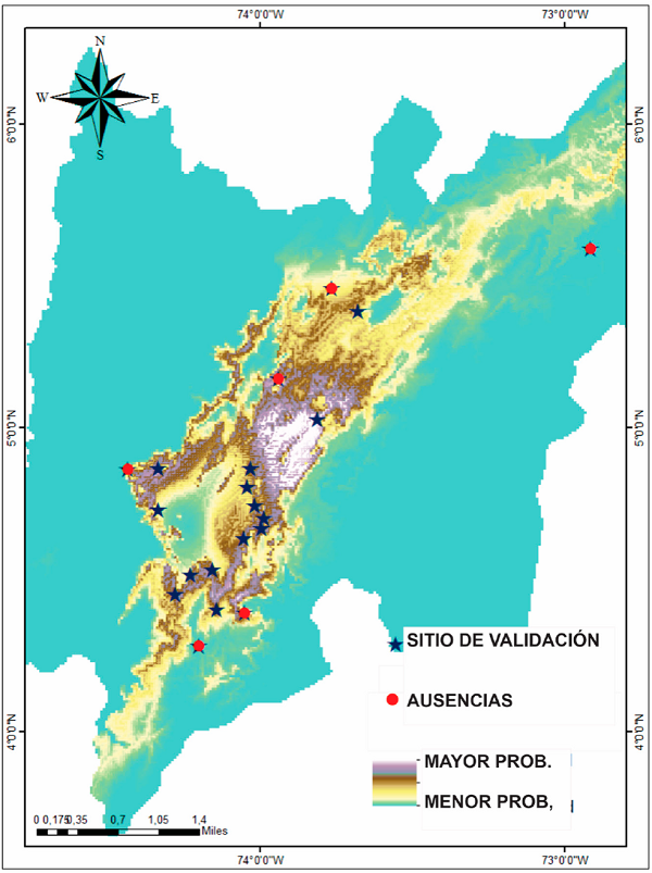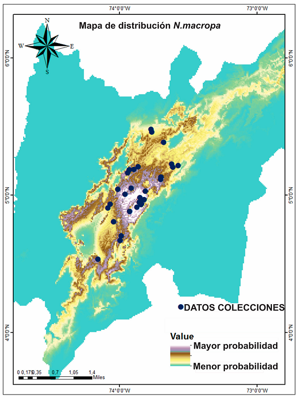 En los restantes 14 puntos de validación, se confirmó la presencia de N. macropa, 7 de los cuales no se habían evaluado antes. Los sitios que predice el modelo se encuentran para los Cerros Orientales de la cuidad de Bogotá, al sur y occidente de la misma, entre estos sitios se encuentran: quebradas del norte de la sabana de Bogotá, calle 172 con 7, Lucero Alto, Usme, Sibaté, Facatativá, Madrid y Chía/Guaymaral.