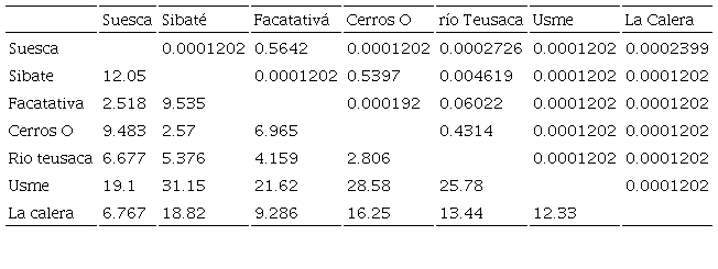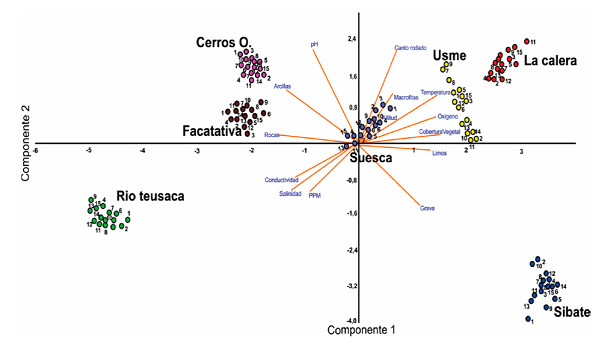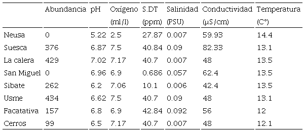 Se observó que la mayoría de cuerpos de agua presentan valores buenos en las características fisicoquímicas, teniendo algunas excepciones como el río Teusaca o Neusa en cuanto a la conductividad (48-60 µs/cm), pH (5.22-7.2) y variables asociadas (sólidos disueltos totales (0.68-40 ppm), salinidad (0.007-0.09 ups, temperatura (12-14ºC) y oxígeno disuelto (2.5-7.3 mg/l) (Tabla 4). La caracterización física de los cuerpos de agua evidenció una asociación a lechos con gran cantidad de limos, cantos rodados y presencia de plantas sumergidas, al igual que coberturas vegetales (Fig. 9); esto apoyado por el PCA (Fig. 10) y la regresión lineal múltiple (Tabla 5).