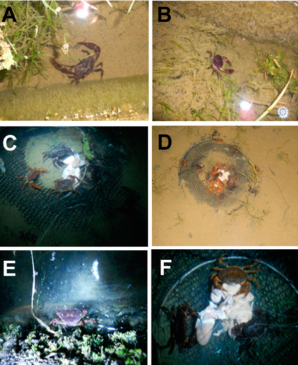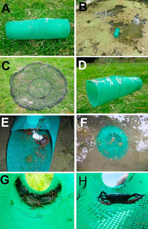 Definidos los 10 puntos de muestreo en la sabana de Bogotá, se realizaron transectos de 150 m, en los que se colocó, cada 10, una trampa tipo tonel en cuyo interior se puso un cebo (hígado de pollo) y se sumergieron durante 2 horas, luego de lo cual eran revisadas para registrar la presencia o ausencia de los cangrejos (Fig. 3A-H). Simultáneamente, se registraron las características fisicoquímicas del agua que podrían afectar la presencia o no de la especie, entre ellas se evaluaron: temperatura, conductividad, sólidos disueltos totales, salinidad, saturación de oxígeno y pH, con una sonda multiparámetro Orion Start de Thermos A221 pH portable, y la altitud y las coordenadas con un gps Caterpillar Cat B26. También se realizó una caracterización de los lechos de los cuerpos de agua según Gracia y Maza-Álvarez (1995) y se clasificaron en cantos rodados, rocas, gravas, limos y arcillas, además de observar la proporción de vegetación circundante, estimando el porcentaje en los transectos evaluados.