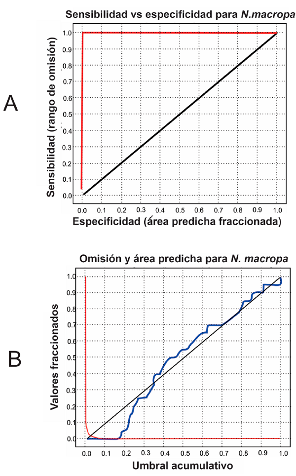 En cuanto a las capas ambientales, se incluyeron las variables bioclimáticas de Worldclim de las cuales se escogieron 8 que poseían el mayor valor de jacknife, obtenidas tanto en los análisis de MaxEnt (Phillips et al., 2006), como en los análisis de modelaje realizados con el software R (R core team, 2013). Una vez obtenidas las 8 variables que influencian la distribución de N. macropa en la sabana de Bogotá, se construyó el modelo de distribución potencial teniendo en cuenta tantos los datos de presencia y las 8 variables ambientales que fueron predictores del nicho (elevación, precipitaciones de octubre, precipitaciones de enero, temperatura media anual, precipitación de febrero, precipitación de marzo, temperatura del mes más frío y precipitaciones de junio). Se realizó la validación del modelo mediante las pruebas AUC y curvas ROC, que permiten evaluar qué tan eficiente fue el modelo para predecir la posible distribución de N. macropa en la sabana de Bogotá. Para que los análisis posmodelo fueran tconfiables se construyó una curva ROC manual mediante el programa R en el paquete Dismo (R core team, 2013). Una vez obtenidos la validación estadística y los mapas construidos con el programa Argmap (2010), se procedió a realizar la validación en campo del modelo.