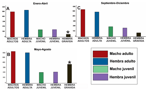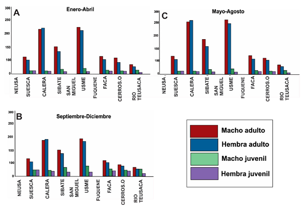 Para los restantes 7 sitios, se encontraron poblaciones estables al observarse que la relación de machos y hembras, tanto adultos como juveniles es 1 a 1 (Collares-Pereira et al., 2000; Diez et al., 2011; Garzón et al., 2005; Hernández et al., 2007; La Torre-Cuadros et al., 2007; Ramírez, 2008; Roa-Fuentes et al., 2013). Se observó una estacionalidad marcada en mayo-agosto (Fig. 6C), encontrándose un notorio aumento en las hembras grávidas y juveniles. Esto es congruente, ya que se conoce que la especie se reproduce de junio a agosto y, además, está relacionada con los picos de sequías e inicio de lluvias en la sabana de Bogotá (Campos y Lasso, 2015; Ortiz, 1981; IDEAM, 2017).