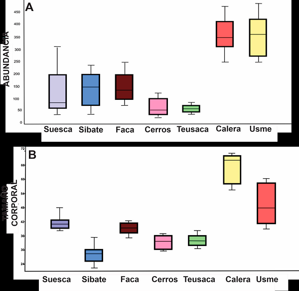 En cuanto a la abundancia total por mes, se encontró que no existe una diferencia significativa (X2, p = 0.175), entre la abundancia de machos y hembras adultos en su totalidad (Fig. 6A-C), pero se observa una diferencia significativa en cuanto al número de juveniles obtenidos y en el número de hembras grávidas muestreadas entre mayo y agosto (X2, p = 0.0055; Fig. 6C). Se encontró que la relación machos y hembras entre los sitios mantenía las proporciones igual a las que se observaron en el primer análisis (1:1) (Fig. 6), sin embargo, en Usme y La Calera la abundancia de cangrejos fue mayor, y el sitio con menor abundancias de cangrejos fue el río Teusaca teniendo diferencias significativas (X2, p = 0.0048; Fig. 7). El análisis exploratorio fue soportado mediante un Anova (W = 0.984, Levene = 4.709E -06, p < 0.005). Se encontró que sí existían diferencias significativas entre los sitios en cuanto a las abundancias de individuos, especialmente entre Usme, La Calera y el resto de sitios (prueba de Tukey; Fig. 8A; Tabla 2). También se registró que los tamaños corporales al igual que la abundancia son mucho mayores en La Calera y Usme respecto a los demás sitios, y el menor tamaño fue observado en Sibaté (p < 0.005), para ello se realizó una Anova (W = 0.97, Levene = 4.037E-20) (Fig. 8B; Tabla 3).