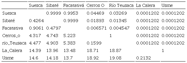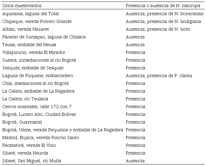 En 3 de los 10 sitios muestreados no se encontró a N. macropa. Estos sitios se caracterizaron por tener una probabilidad alta de presencia de la especie según el modelo de distribución potencial y por ser sitios históricos que registraron la presencia de la especie. Estos sitios son Neusa y Fúquene (Campos, 1994, 2005a), Sibaté, vereda San Miguel y río Muña (Arias-Pineda, 2013). En Neusa las posibles razones son la baja concentración de oxígeno disuelto, temperaturas promedio de 14.5 °C (Tabla 5) y presencia de gran cantidad de plantas en la zona epineustónica.