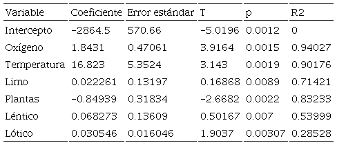 Finalmente, mediante PCA y la regresión lineal múltiple, se constató de modo general que existe una agrupación entre los cuerpos de agua lóticos (río Teusaca, Cerros Orientales, Facatativá, Sibaté y Suesca) y los cuerpos de agua lénticos (Usme y La Calera). Se obtuvo que las variables del PCA explican 2 componentes, el primero explica 59% y el segundo, 29% de la variación. En el PCA1, las variables cuyos autovectores se proyectan en el mismo son: cantos rodados, temperatura, altitud, presencia de plantas acuáticas, pH, arcillas, gravas, salinidad, conductividad y sólidos disueltos totales; mientras que el PCA2 considera el oxígeno disuelto, cobertura vegetal, limos y rocas (Fig. 10). Se observa que las variables que se asocian y caracterizan a los cuerpos de agua lénticos son: temperatura, oxígeno disuelto, cantos rodados, la presencia de plantas acuáticas sumergidas y fuera de ellos y los limos. Algunas de estas características son compartidas por el cuerpo de agua evaluado en Suesca, por esta razón es que se acerca más a los cuerpos de agua lénticos, a pesar de ser un cuerpo de agua lótico. En cuanto a los cuerpos de agua lóticos, se observó una predominancia del sustrato rocoso y arcilloso. Dentro de estos cuerpos evaluados, el río Teusaca posee altos niveles de conductividad, mientras que en Sibaté, la estructura del lecho de la quebrada está caracterizada por lajas grandes y gravas pequeñas.