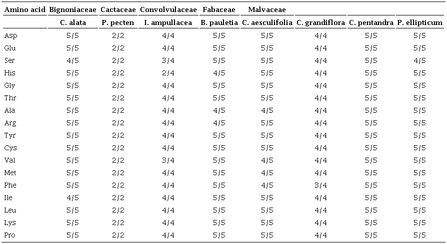 The presence of the 17 quantified free amino acid types in this study was found in all analyzed bat-pollinated plant species. This concurs with Baker and Baker (1977, 1986), who found that the occurrence of individual amino acids in floral nectar is generally constant within a species, and accordingly to Tiedge and Lohaus (2017). Our results clearly showed that most free amino acid types occur in floral nectars of bat-pollinated plants, although they occur in variable concentrations. In contrast with our findings, several other studies have reported fewer amino acids in bat-pollinated species. For example, Scogin (1986) only found 5 amino acids (Ala, Ser, His, Thr and Gly) in the nectar of Cheirosemon platanoides (Sterculiaceae) and Kigelia pinnata (Bignoniaceae). Similarly, Goldberg (2009) only found cysteine (Cys) in all nectar samples of Helicteres baruensis (Sterculiaceae) even though their study evaluated the same 17 free amino acids found in our study. In the bat-pollinated Parkia pendula (Fabaceae), Piechowski et al. (2010) documented 5 of 14 amino acids analyzed and only found proline (Pro) and one other unidentified amino acid in all 5 samples.