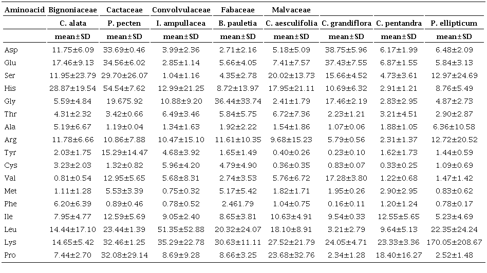 Finally, significant differences were found for Asp concentration between Ceiba grandiflora (Malvaceae) when compared with both, Bahuinia pauletia (Fabaceae; p = 0.005) and Ceiba aesculifolia (Malvaceae; p = 0.038); and for Glu concentration when compared to Ipomoea ampullacea (Convolvulaceae; p = 0.009). No significant differences were found among other plant species and amino acid types.