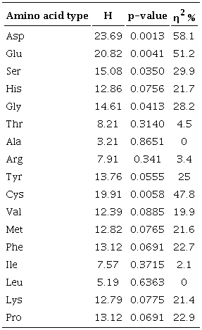 When calculated η2 values for Thr, Arg and Ile, a small size effect was found (0.01 ≤ 0.06); while for Asp, Glu, Ser, His, Gly, Tyr, Cys, Val, Met, Phe, Lys and Pro the obtained size effect was large (≥ 0.14); showing that in the case of these last twelve amino acids, plant species explained its concentration by up to 19 to 58% depending on the amino acid type. No effect size was detected for Ala and Leu (Table 3).
