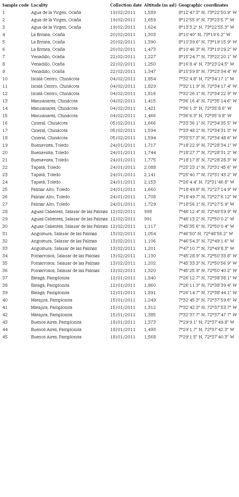 Five municipalities were visited in Norte de Santander department in Colombia during the first trimester of 2011 (Ocaña, Chinácota, Toledo, Salazar y Pamplonita; Table 1). Three locations were surveyed per municipality and randomly collected 3 wild individuals per location with a minimum distance of 800 m between each other. Biological samples consisted of fresh and young leaves (reddish coloration) in an optimal phytosanitary state, which were preserved in silica gel until laboratory processing. Geographical location data was recorded in order to plot our sampling localities in a distribution map (Fig. 1).