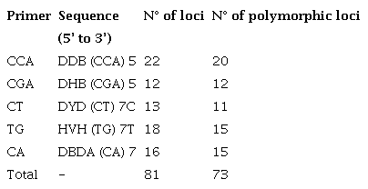 DNA concentration ranged between 10 and 30 ng/μl. Extracted DNA had good quality and was suitable for most of the PCR amplification. The 5 RAM primers used in this work, yielded 81 loci with molecular weights between 100 and 1,100 bp. The CCA primer had the highest number of loci, n = 22 and CGA the lowest (n = 12). The CCA primer exhibited the highest number of polymorphic loci (n = 20). The number of polymorphic loci was 73 (Table 2).