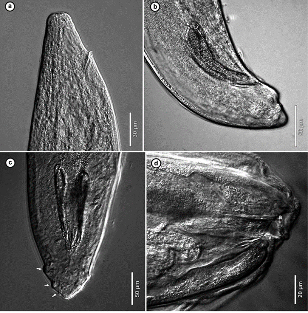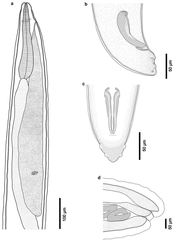 Male (based on 10 adult specimens). Total body length 6.5-9.4 (7.6 ± 1.2) mm. Body width at level of base of the oesophagus 80-100 (92 ± 8.7); maximum body width 120-170 (146 ± 22.6). Oesophagus 160-230 (200 ± 32.4) long. Oesophagus length/body length ratio 40:1. Nerve ring 35-55 (45 ± 9.5), and excretory pore 40-62 (51 ± 10.9) from anterior end. Excretory gland 530-640 (564 ± 48.4) long. Copulatory bursa not evident, with 3 pairs of ventrolateral papillae homologous to bursal rays., not clearly defined (Figs. 1b, c, 2b, c). Two spicules short, robust and with blunted distal end (Figs. 1b, c, 2b, c). Spicules subequal, 88-105 (96 ± 7.9) long. Spicules length/ body length ratio 81:1. Gubernaculum well sclerotized and robust, with distal and proximal ends narrow and tapere, 22-35 (27 ± 4.4) long (Figs. 1b, 2b).