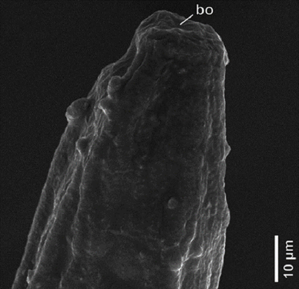 Female (based on 10 adult specimens). Total body length 15.2-18 (16.8 ± 1.3) mm. Body width at level of base of the oesophagus 140-160 (151 ± 9.7); maximum body width 370-410 (392 ± 12.4). Oesophagus 260-360 (309 ± 35.6). Oesophagus length/body length ratio 54:1. Nerve ring 48-65 (57 ± 5.4), and excretory pore 53-72 (63 ± 6.1) from anterior extremity. Excretory gland 606-739 (675 ± 43.7) long. Vagina and vulva with no distinctive sphincters (Figs. 1d, 2d). Posterior end bluntly rounded with vulva and anus terminal, located at the tip (Figs. 1d, 2d). Ovoviviparous. First-stage larvae into the vagina with 192-258 (227 ± 21.5) long (n = 30) and 12-17 (16 ± 1.7) wide (n = 30) (Figs. 1d, 2d).