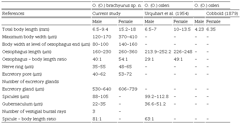 In the comparative morphometric study of the 2 species of O. (Oslerus) (Table 1), we observed that the females of O. (O.) brachyurus sp. nov. are larger than the females of O. (O.) osleri studied by Cobbold (1879) and Urquhart et al. (1954), that the oesophagus of males and females of the new species have a larger oesophagus length/total body length ratio compared to the specimens studied by Urquhart et al. (1954), and the males of O. (O.) brachyurus sp. nov. have larger spicules and a smaller gubernaculum than O. (O.) osleri (Table 1).