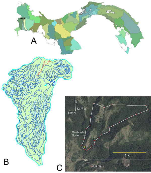 Quebrada Norte, a second order tributary of the Río Colorado in the upper extent of that watershed was sampled monthly from December 2017 through December 2018. A Malaise trap was placed across the stream, roughly 80 m above its confluence with the Río Colorado, to collect the caddisflies. The sample location’s altitude was 1,920 m. Sampling intervals varied from 3 to 6 days dependent on the weather and amount of material that accumulated. Quebrada Norte, is approximately 1.0- 2.5 m wide, contains a variety of substrates ranging from small boulders to fine sand, and joins the Río Colorado near the entrance to MTCF (Fig. 1C). The riparian corridor bordering this stream is heavily wooded along most of its extent.