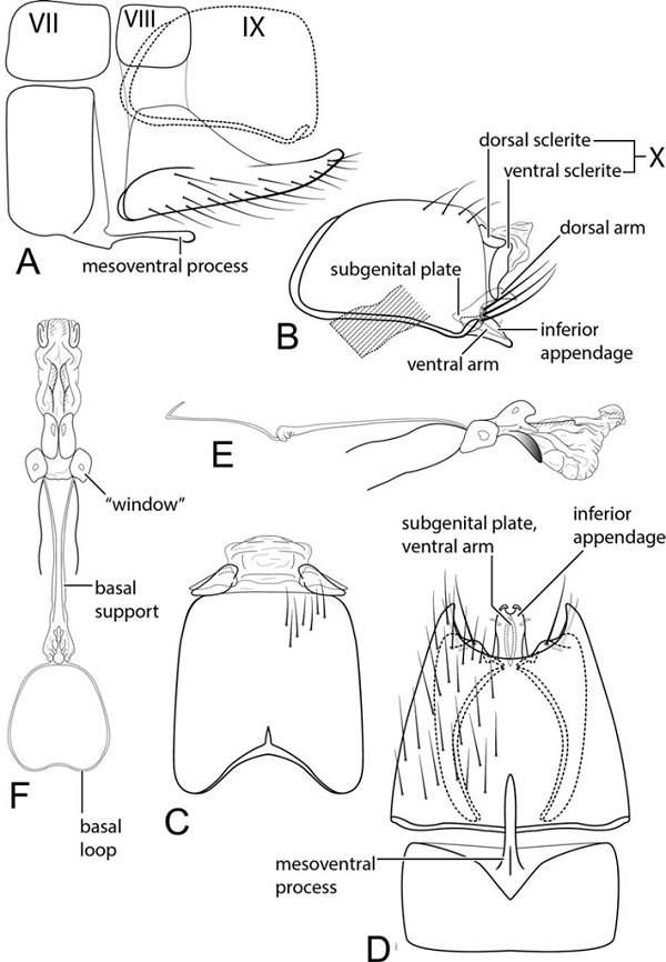Holotype male: forewing length 2.6-2.8 mm (n = 3). Head unmodified, with 3 ocelli; antennae unmodified. Tibial spur count 1, 3, 4. Color in alcohol brown, denuded. Genitalia: abdominal sternum VII with digitate mesoventral process (Fig. 2B, D). Sternum VIII with posteroventral projection, in ventral view with posterior margin concave (Fig. 2B, D). Segment IX anterolateral margin convex; posterolateral margin broadly convex; in dorsal view anterior margin concave, posterior margin straight (Fig. 2C). Tergum X with dorsal sclerite simple; ventral sclerite semielliptic, posterior margin with small mesal projection (Fig. 2B); membranous apex small. Subgenital plate with dorsal arm simple, bent posteriorly, apex pointed; ventral arm straight, simple, apex pointed (Fig. 2B); in ventral view narrow, oval. Inferior appendage broadest mesally, base subquadrate, apex rounded, bearing single dorsal spine (Fig. 2B); in ventral view (Fig. 2D) almost entirely fused, with small rounded emargination at apex. Phallus tubular basally, constricted at midlength with median complex bearing basal loop with elongate basal supports and spherical dorsal “windows”; membranous apex bearing ventral “bulge”, elongate ventro-basal sclerite, and pair of small apicodorsal lobes (Fig. 2E, F).