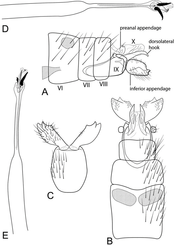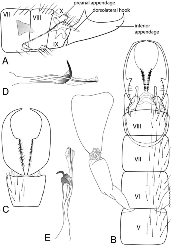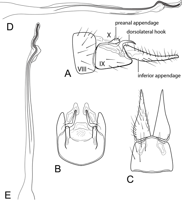 Male: the head and body were lost after the single specimen was examined and described. No special features of the head or body were noted during our initial examination. Color in alcohol brown, denuded. Genitalia: abdominal sternum VII without mesoventral process (Fig. 8A). Sternum VIII unmodified (Fig. 8A). Segment IX anterolateral margin convex; posterolateral margin convex, produced posteroventrally (Fig. 8A); in dorsal view with posterior margin membranous (Fig. 8B). Tergum X small, membranous, amorphous (Fig. 8A, B). Preanal appendage small, digitate (Fig. 8A, B). Dorsolateral hook slender, curved (Fig. 8A). Inferior appendage setose, elongate, broadest basally, apex narrow (Fig. 8A). Phallus elongate, base originating in abdominal segment V, tubular, membranous apex, with single elongate spine extending apically within membranous sheath (Fig. 8D, E).