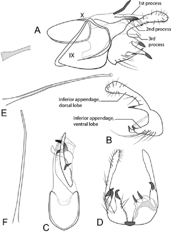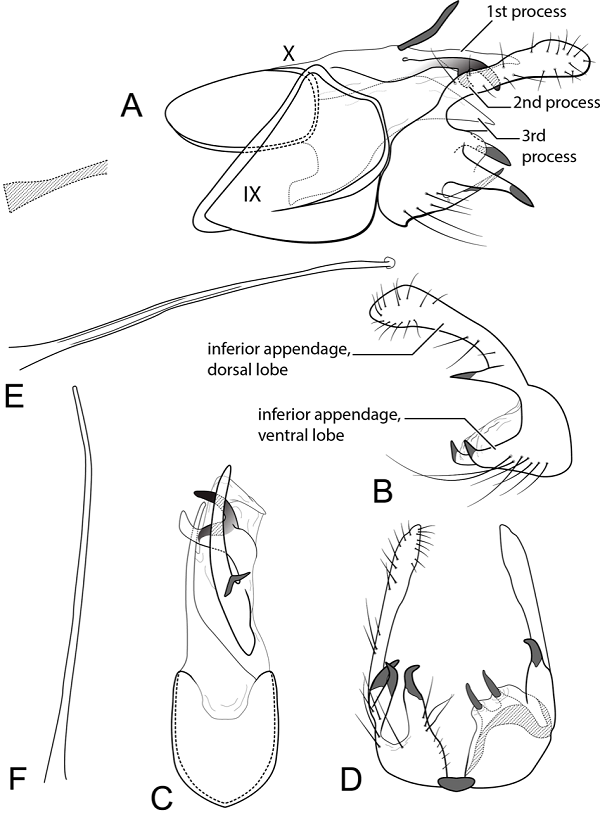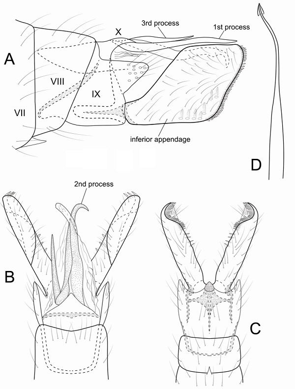 Tergum X sclerotized, highly developed with 3 processes (Fig. 7A, B): 1st process simple, apex digitate in dorsal view; 2nd process simple, elongate, apex curved; 3rd process simple straight, apparent in dorsal view. Inferior appendage setose, subquadrate with truncate anteroventral production (Fig. 7A), posterior margin with row of peg-like setae (Fig. 7A, C). Phallus tubular, elongate, simple, thread-like (Fig. 7D).