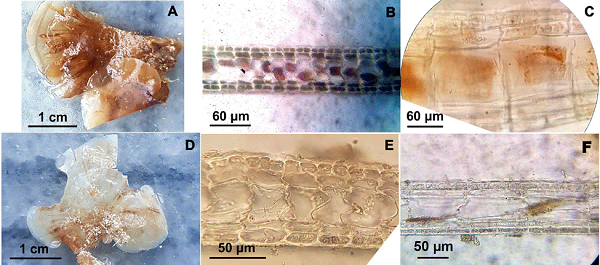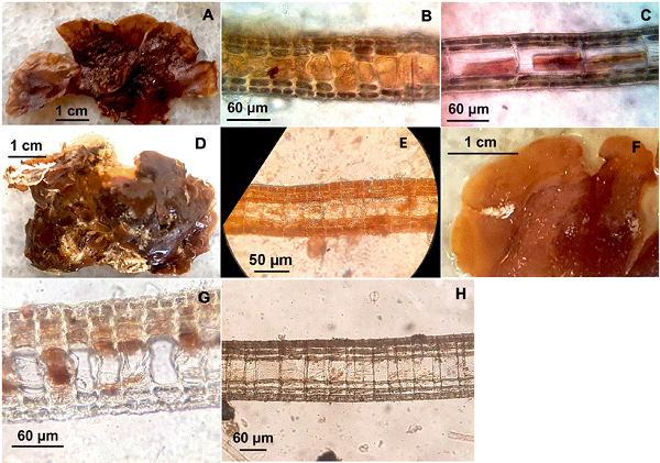 The thallus is light brown and displays decumbent blades. The blade can be simple or reniform (2.3-3.5 cm long, 1.1-4.1 cm wide, 84-98 thickness). It is formed of a single-celled medulla (30-50 μm height) with 2 cortical cell layers on each side, dorsally and ventrally. The specimens of this species displayed 5 layers including the medulla. In longitudinal section a single subcortical cell layer is shown covering a medullary cell and supporting the outer cortical cell layer. The medullary cell is 72-95 μm long. The dorsal cortical cell layer showed 4 cells and the ventral cortical section displayed 2 cells. Otherwise, the dorsal subcortical cell layer displayed 1-2 cells and the ventral subcortical cell layer exhibited 1-2 cell. In transverse section a single subcortical cell layer is shown covering a medullary cell and supporting the outer cortical cell layer. The medullary cell was 30-35 μm wide. The dorsal cortical cell layer exhibited 2 cells and the ventral section displayed 1-2 cells. Additionally, the dorsal and ventral subcortical cell layer displayed only 1 cell. The dorsal cortical and subcortical sections were 14-16 μm and 14-17 μm high, respectively. Also, the ventral cortical and subcortical section showed 11-16 μm and 10-14 μm height, respectively.
