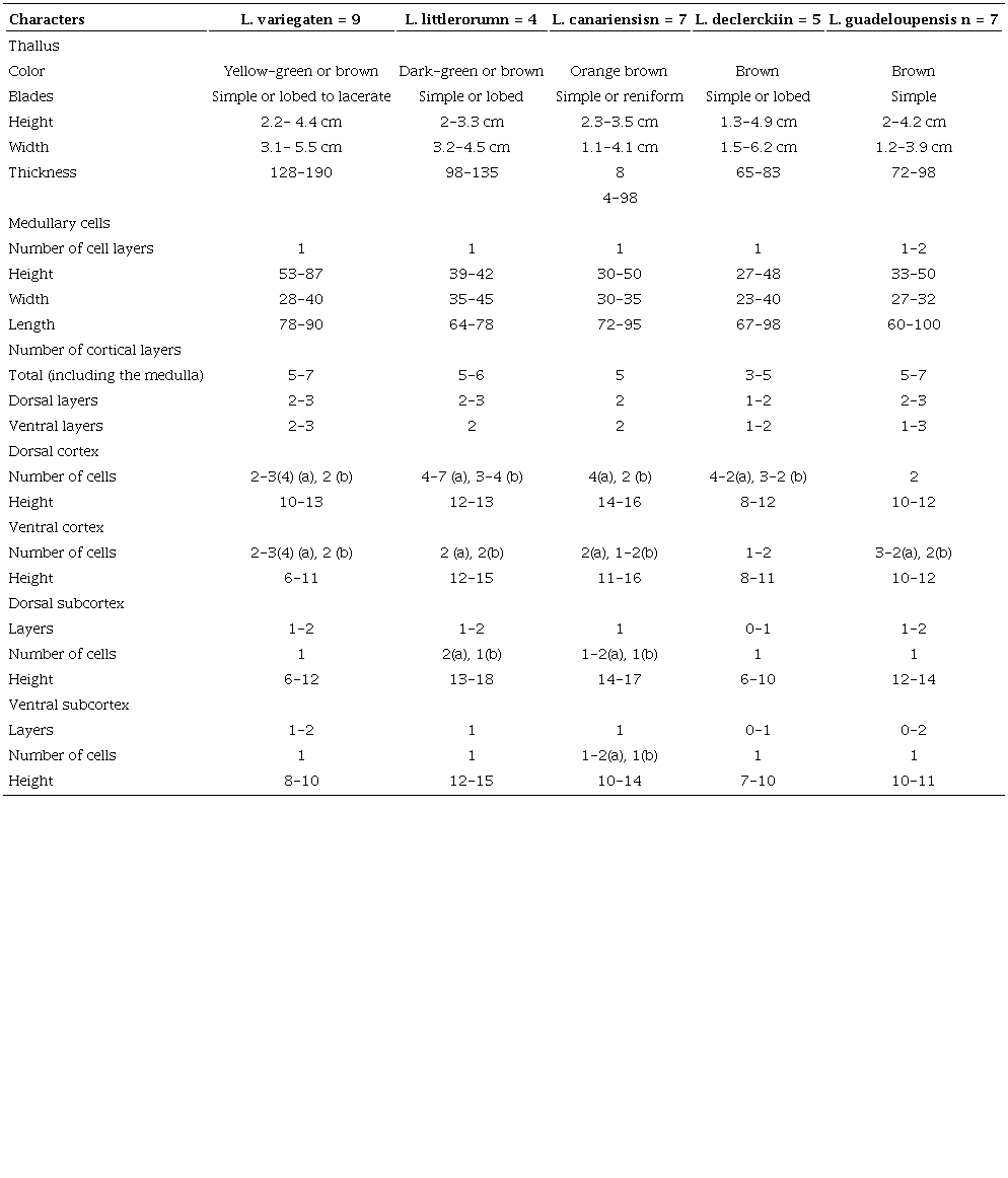 The thallus can be yellow-green or brown. It has erect-ruffled blades (2.2-4.4 cm long, 3.1-5.5 cm wide, 128-190 thickness). The specimens from Cuban material shown simple or lobed to lacerate blades, which are composed of a single-celled medulla (53-87 μm height) with 2-3 cortical cell layers on each side (ventrally and dorsally). They displayed 5-7 layers including the medulla. In longitudinal section the specimens displayed 1-2 subcortical cell layers covering a medullary cell (ventrally and dorsally) and supporting the external cortical cell layer. The medullary cell showed 78-90 μm length. The dorsal and ventral cortical cell layer displayed 2-3 (4) cells. Both, the dorsal and ventral subcortical layers displayed only 1 cell. In transverse section 2 dorsal and ventral subcortical cell layers are usually shown (each with 1 cell) covering a medullary cell and supporting the outer cortical cell layer. Sometimes the subcortical cell layers displayed 1 layer rather than 2. The medullary cell displayed 28- 40 μm width. Both, the dorsal and ventral cortical cell layer exhibited 2 cells. The dorsal and ventral subcortical cell layer showed only 1 cell. Additionally, the dorsal cortical and subcortical section displayed 10-13 μm and 6-12 μm height, respectively and the ventral cortical and subcortical section showed 6-11 μm and 8-10 μm height, respectively.