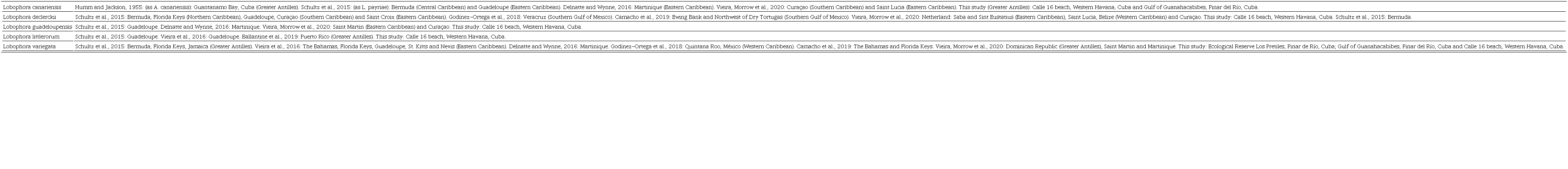 The genus Lobophora has been reported at different habitats in the Greater Caribbean Sea (seagrass and macroalgae beds, coral reefs, mangroves and rocky reefs) according to Coen and Tanner (1989). From the Cuban material, we found L. canariensis, L. declerkii and L. littlerorum on rock substratum in agreement with Vieira, Morrow et al. (2020), but not on coral reef. Besides, we also found L. canariensis growing adjacent to L. declerckii on rocky reef. However, we could observe that they occupy different niches. While L. canariensis usually displayed small decumbent blades in shaded areas, L. declerckii showed large decumbent blades further exposed to the light. This ecological feature coincided with those proposed by Vieira, Morrow et al. (2020) for these species. On the other hand, we found L. guadeloupensis on rock reef and sand substratum in agreement with Vieira, Morrow et al. (2020), but not on seagrass bed. With respect to L. variegata we found this species on rock substratum and seagrass bed as it was found by Vieira, Morrow et al. (2020). The fact we did not find these species on coral reef is due to the low sampling effort. We recommend in future work to sample in other habitats such as mangroves and coral reefs.